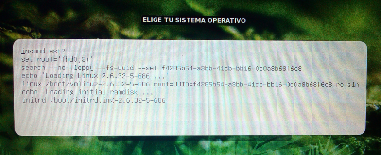 *Al iniciar la computadora y mostrar la pantalla de selección de sistema operativo, escoger "Modo de Restaurar" o "Modo de Consola" y presionar la tecla "e" para pasar a editar la linea de arranque y observaras una pantalla como esta.